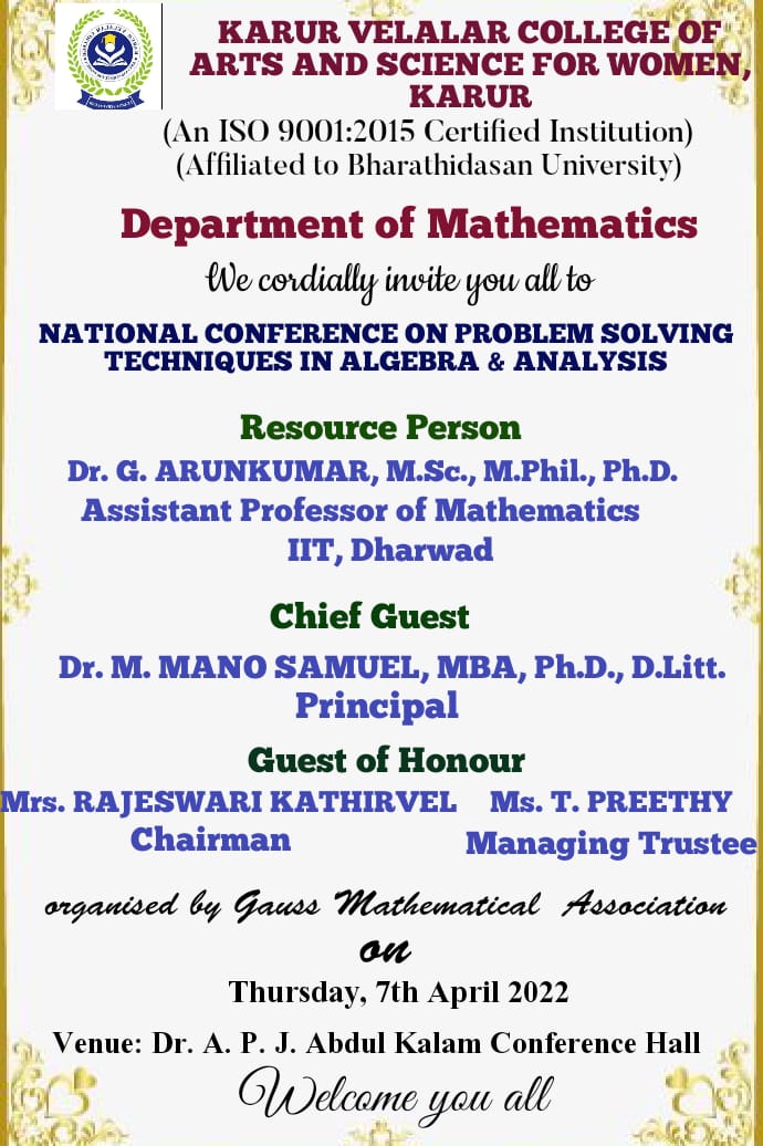 The upcoming event “National Conference on Problem Solving Techniques in Algebra and Analysis” is organized by Karur Velalar College of Arts & Science (For Women). This conference aims to bring together experts, researchers, and scholars in the field of mathematics to discuss and explore various problem-solving techniques in algebra and analysis.